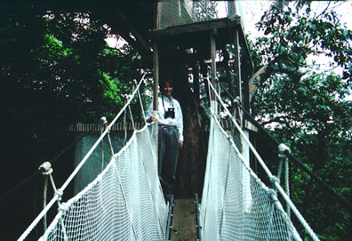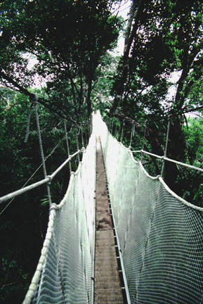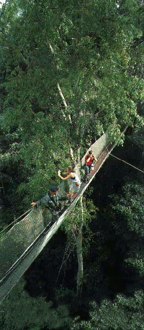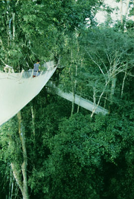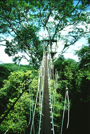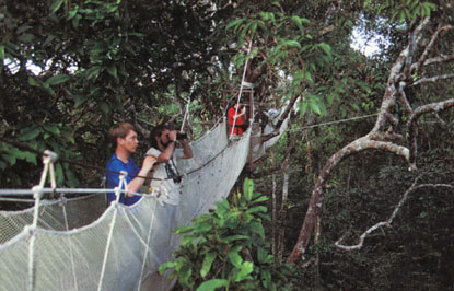 The 450-meter long ACEER Canopy Walkway is the longest canopy walkway in the world and was the first to be constructed in the Amazon Basin. It is basically a series of suspension bridges connecting 13 large, canopy-emergent trees, with one or two observation platforms in each tree. The canopy walkway was built for tourist use and as a research and education tool. Starting from atop the highest hill in the area, the walkway goes out at a slight grade, quickly climbing into the tops of the trees. It winds around the hill through the tops of the tallest trees, averaging more than 25 meters above the ground and reaching 36 meters above the ground at its high point. With its unprecedented access to the forest canopy it provides a wonderful opportunity to view and study the rich plant and animal life of that habitat. Though only a relatively few researchers have used the walkway so far, its research potential is great. With the many school groups that use it, the walkway has been an effective tool for getting them interested in and teaching them about the rainforest. |