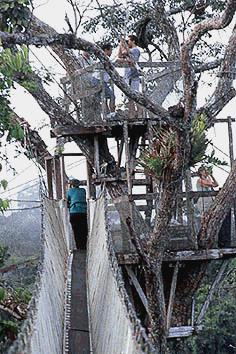 Protection of the environment, and in particular, protection of the support trees used for the canopy walkway was of prime concern to us. Care was taken to choose a route that would not require the removal of any limbs or large branches, and extremely minimal pruning was done to the trees. In the design used, neither the walkways nor the platforms are nailed or bolted to the trees. | |